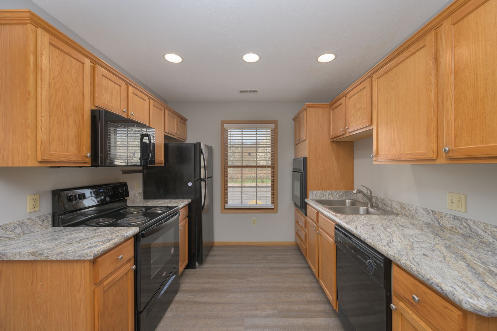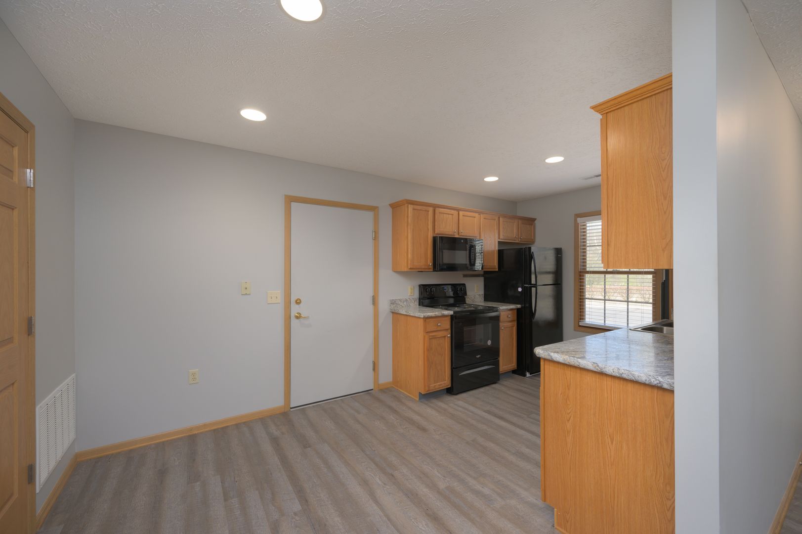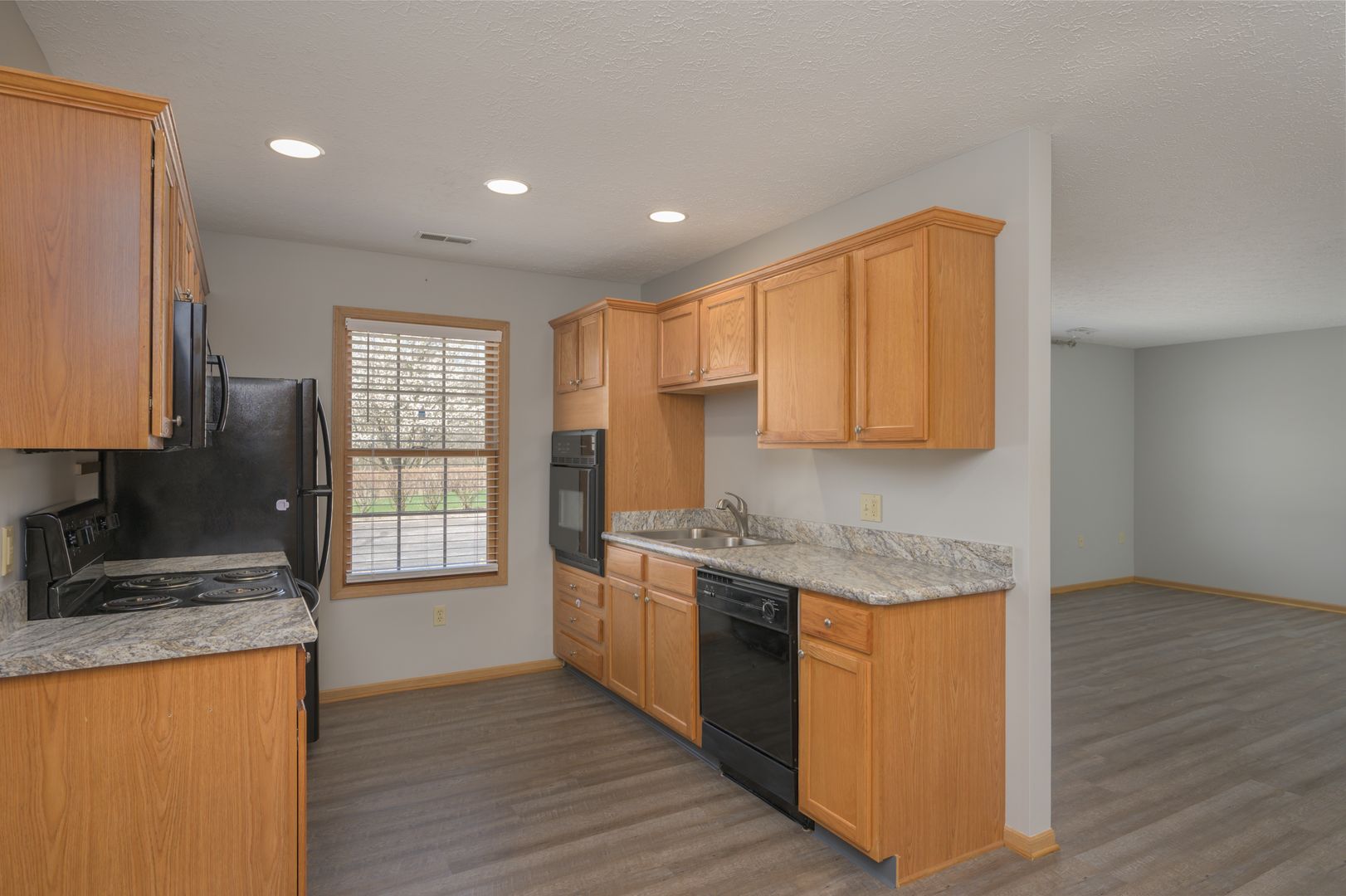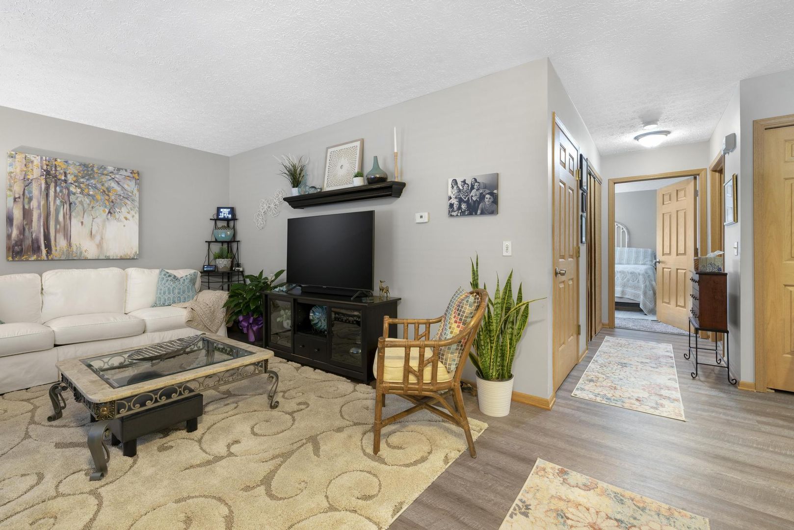 At 3785 Long Dr., a 5 unit ranchplex features oak kitchens with updated appliances including double ovens, large master bedrooms with double closets, master bathrooms with walk-in showers, outdoor patios, laundry connections, central air and attached 1 car garages with remote access.